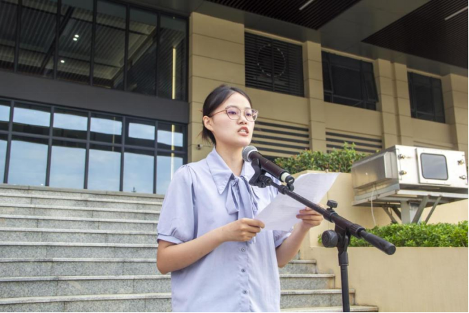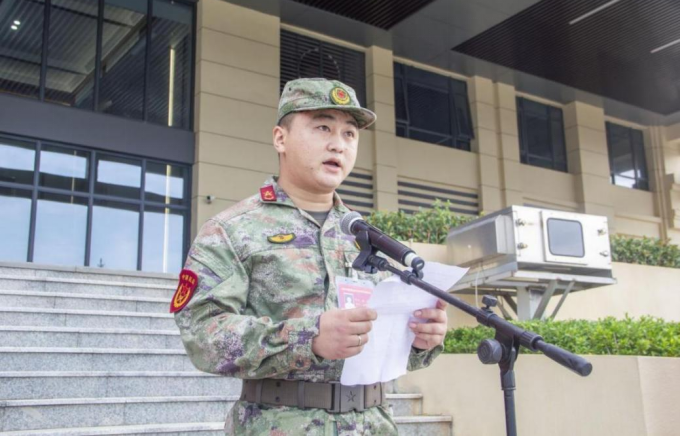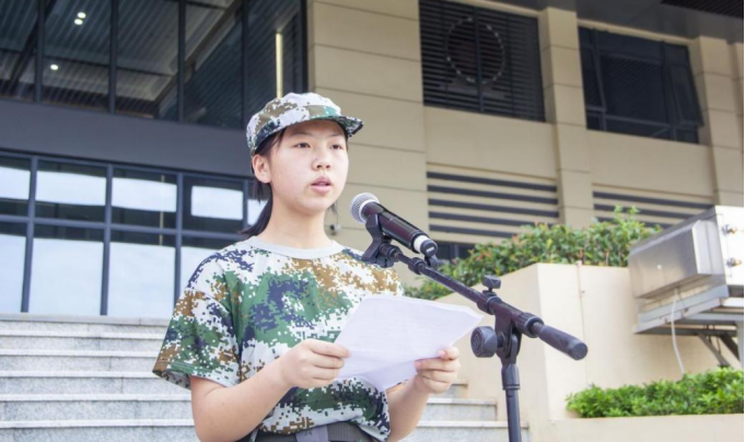 随后,教官代表宋民发言。他目光坚定、语气铿锵,向全体师生郑重承诺:所有带训教官将严格遵照学校军训工作计划,以高标准、严要求推进各项训练任务,确保过程科学规范、安全有序,切实帮助同学们在军训中锤炼意志、收获成长。