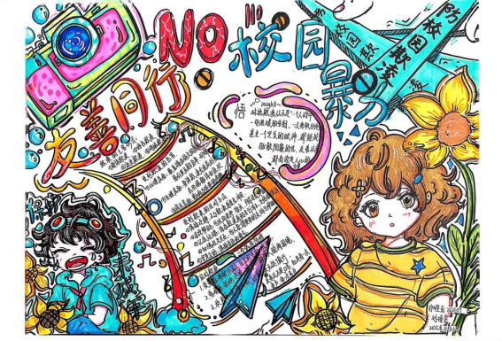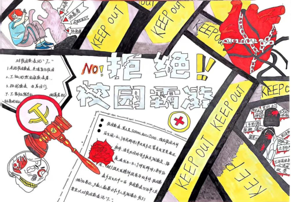 活动开启后,同学们踊跃参与、积极创作,围绕“拒绝校园暴力”“反对欺凌”“共建和谐校园”等主题,以画笔勾勒友善轮廓,用文字书写正义心声。一幅幅作品色彩鲜明、构思新颖独特有的以漫画形式生动揭示欺凌危害,画面直击人心;有的用清晰条目列出应对技巧与求助渠道,内容实用易懂;还有的搭配温暖插画传递包容理念,情感真挚动人,充分展现了同学们对校园欺凌的深刻认知与对和谐校园的热切期盼。
