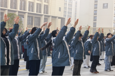 伴随着古朴悠扬的古典音乐,各班级方阵凝神静立、徐徐起势。“两手托天理三焦,左右开弓似射雕”的口令声中,师生们动作柔和沉稳、圆活连贯,一招一式间尽显八段锦“动静相宜、形神兼备”的独特韵味。晨光映照下,整个校园浸润在传统养生文化的氛围中,形成一道兼具古韵与朝气的校园风景线。