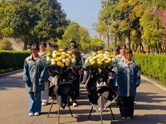 随后师生代表敬献花篮。在肃穆的氛围中,主祭人代表全体师生缓步走向纪念碑,将承载着无限哀思的花圈敬献于碑前。缎带上 “革命烈士永垂不朽” 的金色大字熠熠生辉,主祭人仔细整理缎带,动作轻柔而坚定,每一个细节都饱含着对先烈的深切缅怀与崇高敬意。敬献完毕,主祭人庄重归队,全场保持肃静。