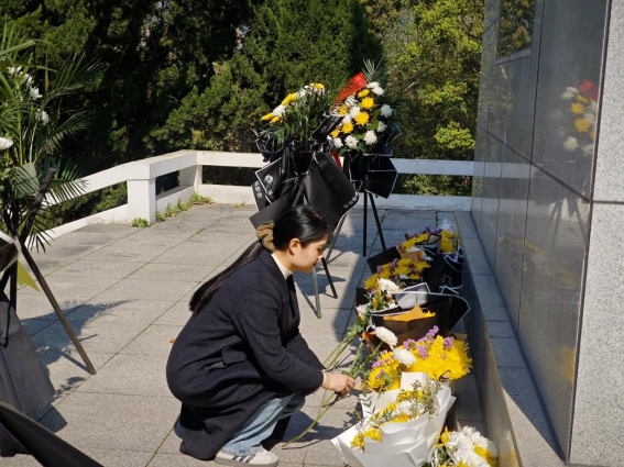 默哀结束后,师生代表手持洁白菊花,依次缓步走向纪念碑,将鲜花轻轻放在碑前,鞠躬致敬。随后,全体党员面向党旗重温入党誓词,团员青年重温入团誓词,铿锵有力的誓言回荡在陵园上空,既是对先烈的深情告慰,更是传承遗志、勇担使命的庄严承诺。